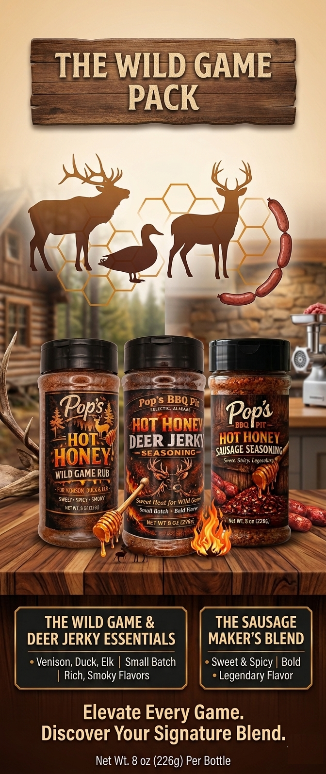 - Pop’s Hot Honey Deer Sausage Seasoning
